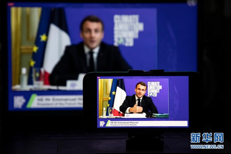 这是12月12日在美国纽约拍摄的法国总统马克龙在气候雄心峰会上通过视频发表讲话的屏幕画面。