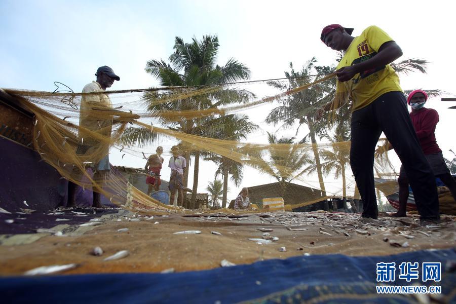12月12日,在斯里兰卡首都科伦坡附近的莫勒图沃,渔民在海边整理渔网。