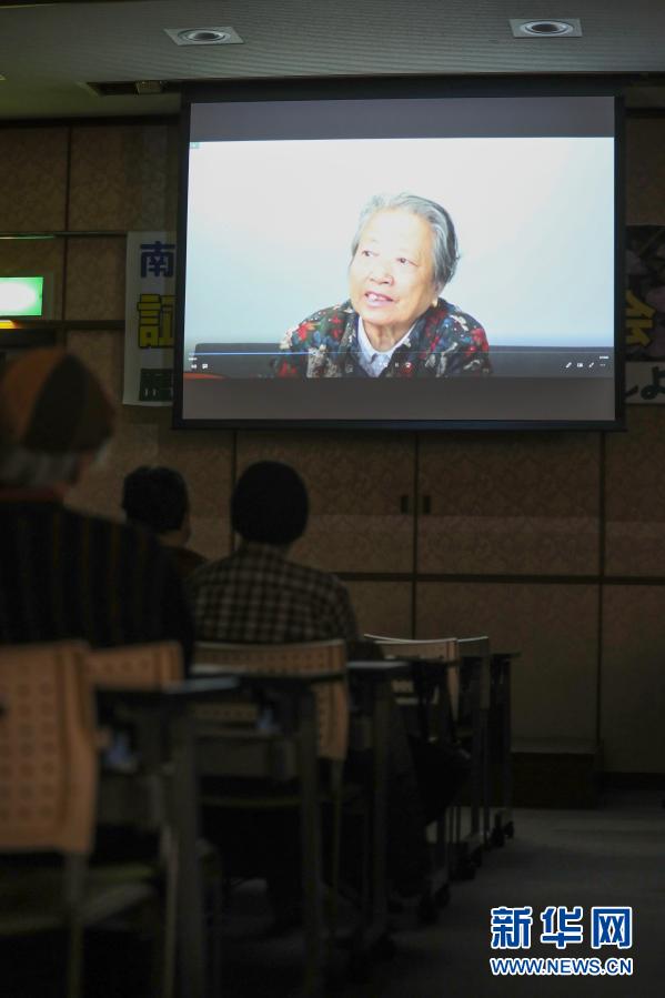 12月13日,人们在日本东京举行的纪念南京大屠杀83周年集会现场观看南京大屠杀幸存者石秀英的讲述纪录片。新华社记者 杜潇逸 摄