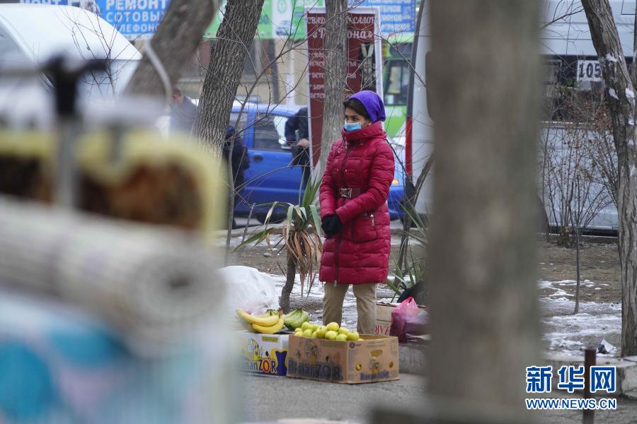 12月14日,在乌兹别克斯坦首都塔什干,商贩佩戴口罩在街边售卖水果。新华社发(扎法尔摄)