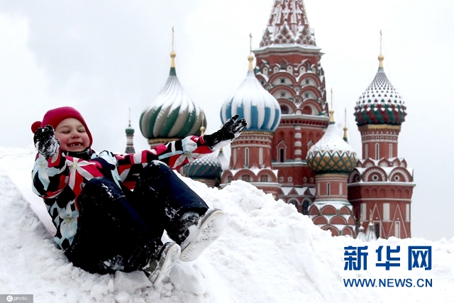 莫斯科迎来大雪红场成游乐场 儿童玩雪不亦乐乎