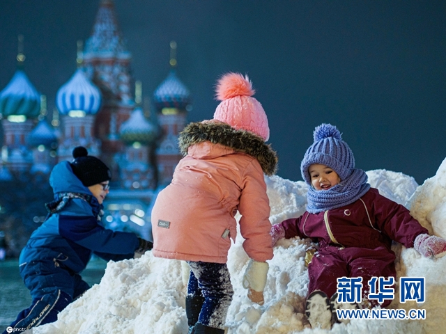 莫斯科迎来大雪红场成游乐场 儿童玩雪不亦乐乎