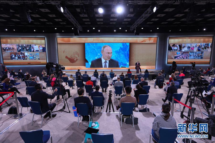 12月17日,在俄罗斯首都莫斯科,普京年度记者会以视频方式举行。当日,俄罗斯总统普京在莫斯科召开年度记者会。受疫情影响,本次年度记者会以普京在莫斯科郊区的官邸通过视频与记者交流的方式举行。新华社发(叶甫盖尼·西尼岑摄)