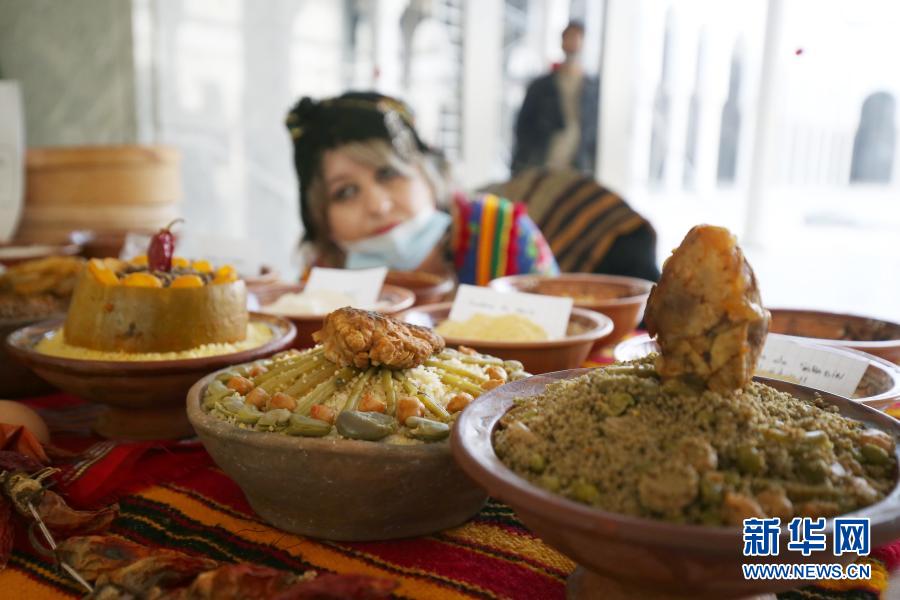 这是12月17日在阿尔及利亚首都阿尔及尔一个文化活动上拍摄的“古斯古斯”。