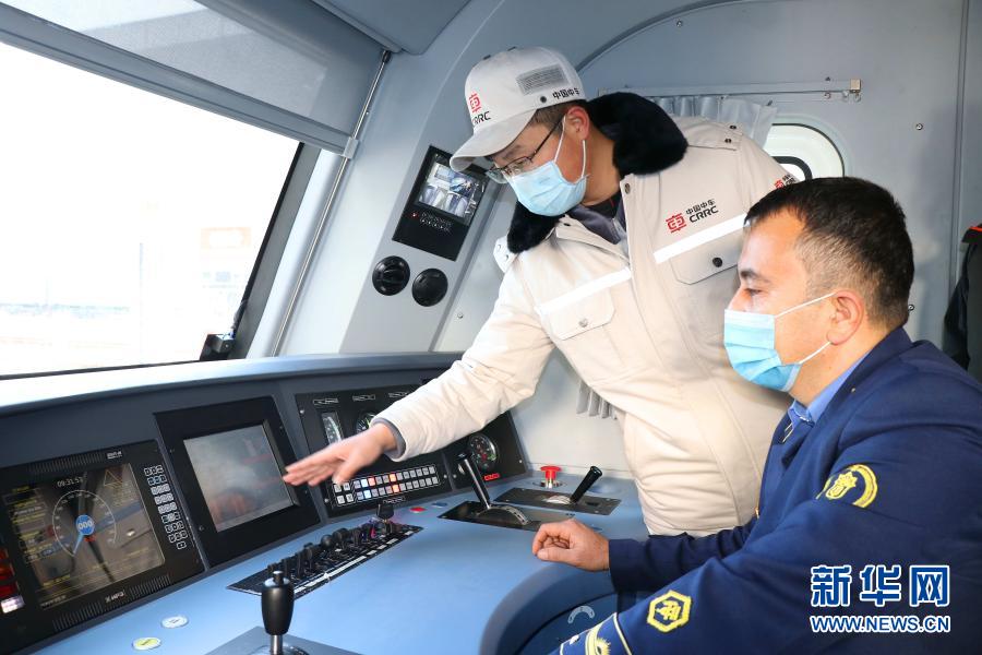 12月17日,在乌兹别克斯坦塔什干,中方技术人员向乌方驾驶员展示电力机车的操作平台。