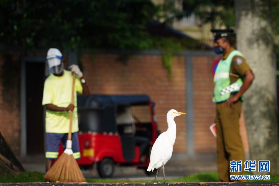 12月19日,在斯里兰卡科伦坡贝拉湖畔,一只鹭鸶从警察和清洁工人前经过。