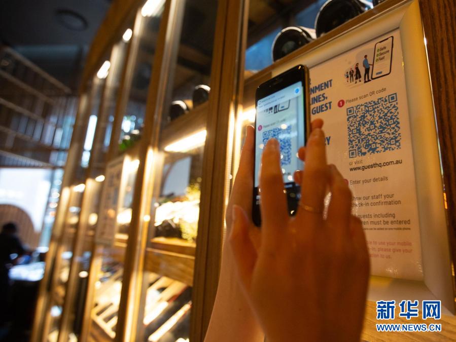 12月19日,在澳大利亚悉尼,市民进入餐厅前扫描二维码进行网络登记。新华社发(胡泾辰摄)