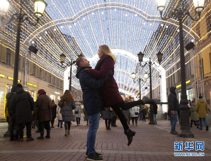 12月20日,一对情侣在俄罗斯圣彼得堡圣诞集市上拥抱。