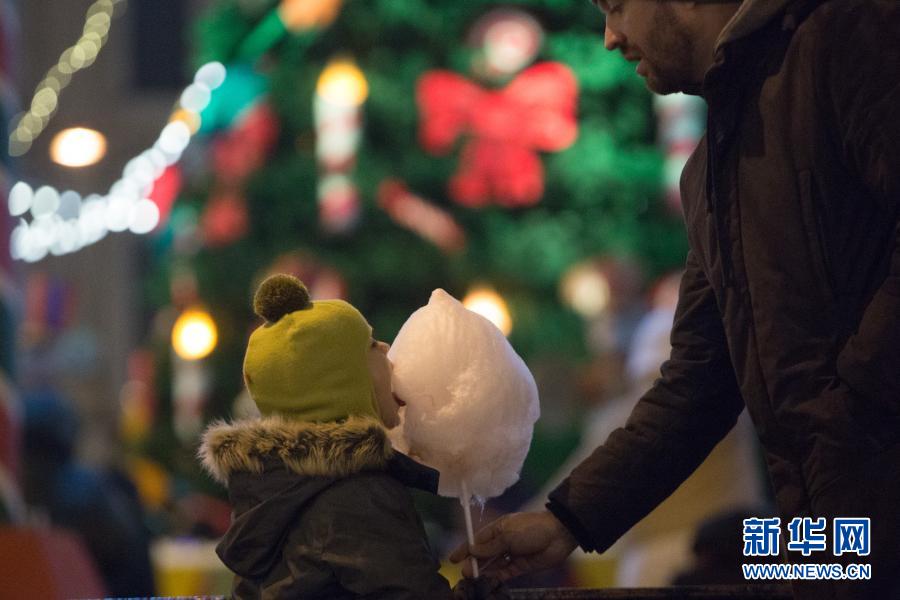 12月20日,小朋友在俄罗斯圣彼得堡圣诞集市上吃棉花糖。