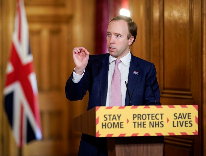 5月4日,在英国伦敦,英国卫生大臣马修·汉考克在唐宁街10号举行的新闻会上发表讲话。新华社/路透