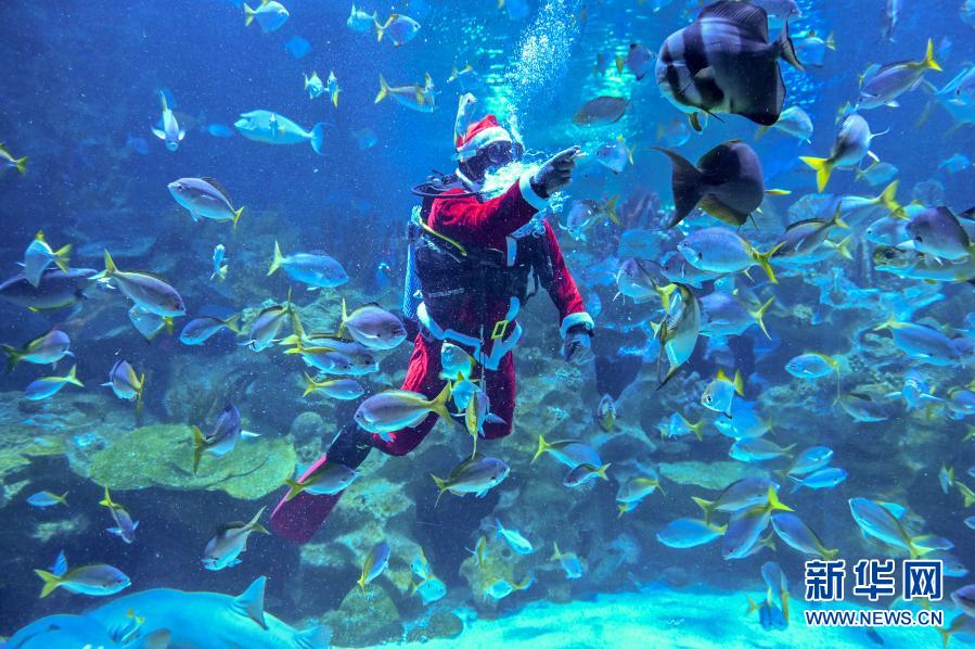 这家水族馆近日推出“圣诞老人”潜水表演,迎接圣诞节的到来。