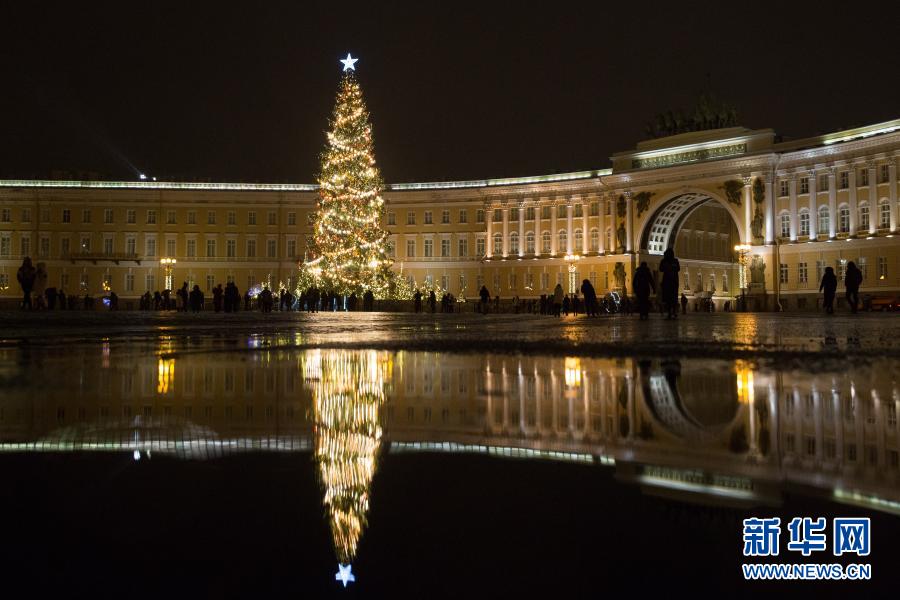 这是12月24日拍摄的俄罗斯圣彼得堡冬宫广场枞树上的灯饰。新华社发(莫京娜摄)