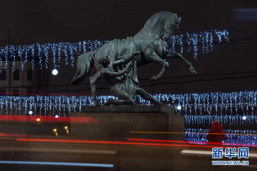 这是12月24日拍摄的俄罗斯圣彼得堡涅瓦大街阿尼奇科夫桥上的灯饰。新华社发(莫京娜摄)
