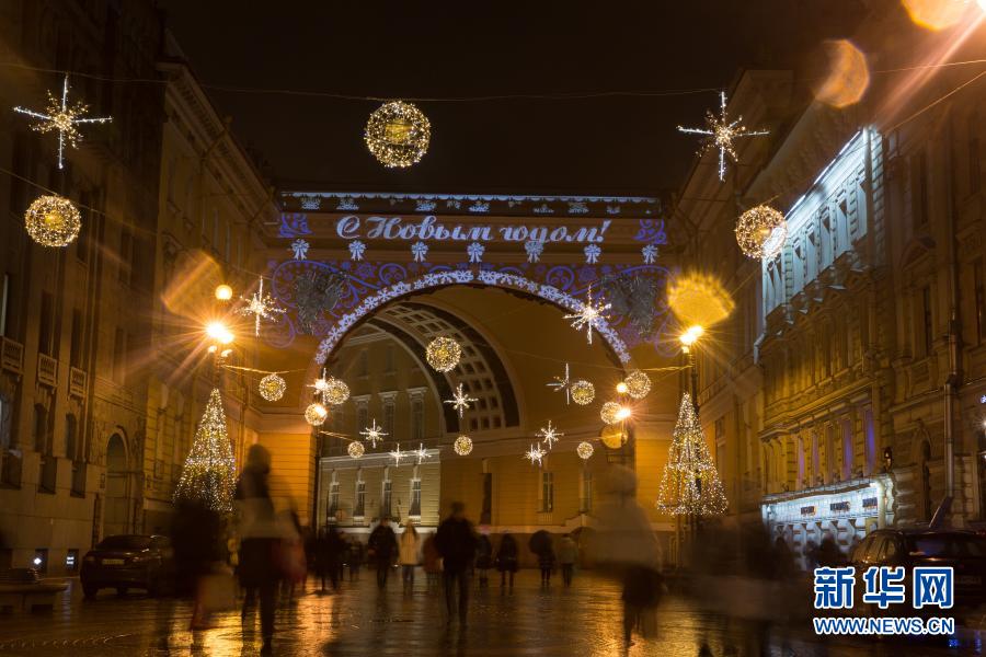 这是12月24日拍摄的俄罗斯圣彼得堡街头的灯饰。新华社发(莫京娜摄)