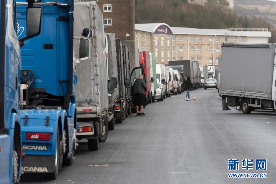 12月22日,在英国多佛,货车因多佛港关闭在外排队。新华社发(雷伊·唐摄)