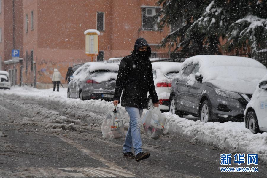 12月28日,在意大利北部城市米兰,一名行人走在雪中。新华社发(达尼埃莱·马斯科洛摄)