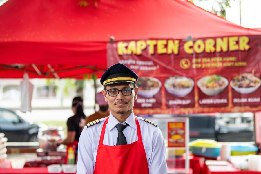 这是在马来西亚首都吉隆坡市郊拍摄的身穿飞行员制服的阿兹林(12月2日摄)。阿兹林由于疫情影响航空业而被辞退,为了维持生计,他在吉隆坡市郊的住所附近设立了一个路边摊位,售卖自家做的各种当地小吃。“我现在不介意在飞机上还是在大街上工作,我没有为摆摊感到不好意思,我需要赚钱维持家庭的开销,其他的都不是问题。”阿兹林说,“我总是向前看,这就跟驾驶飞机一样,只能向前飞。前方总有机遇。”
