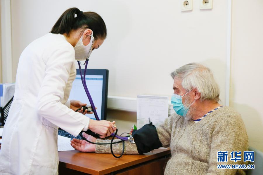 12月30日,在俄罗斯首都莫斯科,医护人员在进行疫苗接种前为一名老人测量体温。新华社发(亚历山大摄)
