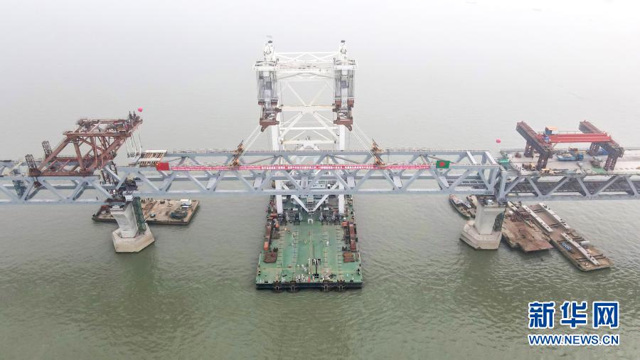 12月10日,在位于孟加拉国首都达卡西南约40公里处的帕德玛大桥项目现场,万吨级中心架梁起重船“天一号”将最后一跨钢梁架设到指定桥墩上,标志着帕德玛大桥项目主桥钢梁成功合龙。大桥全长7.7公里,采用双层钢桁梁结构,上层为四车道公路,下层是单线铁路。该项目由中国中铁承建,建成后将极大促进孟加拉国及南亚区域互联互通和经济发展。