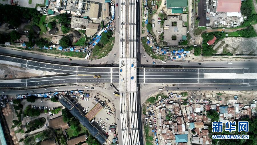 这是5月2日在坦桑尼亚达累斯萨拉姆拍摄的建设中的乌本戈立交桥项目。乌本戈立交桥是坦桑尼亚政府主导的第一个立交桥项目,主要由一座三层立交桥和配套分流道路构成,由中土集团东非有限公司承建。