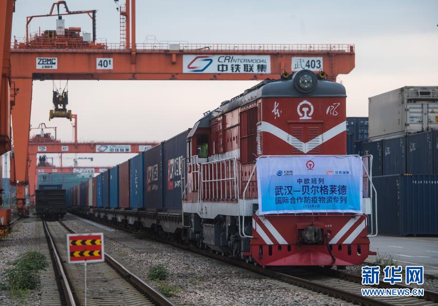 5月9日,开往塞尔维亚贝尔格莱德的中欧班列(武汉)准备从吴家山站驶出,该班列满载3500立方米、294.42吨国际合作防疫物资,支援塞尔维亚及周边国家抗击新冠肺炎疫情。