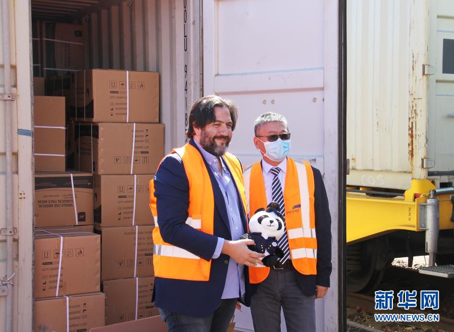 6月23日,在法国巴黎东南郊的瓦朗通,中远海运法国公司总经理姚宏智(右)与法国订货方代表在班列集装箱前合影。历经19天,跨越上万公里,满载防疫物资的中欧班列23日抵达法国巴黎。此次班列是中法首趟抗疫物资专列,载运口罩、手套、水溶袋及免触碰消毒液机等产品,货值达1000万欧元。