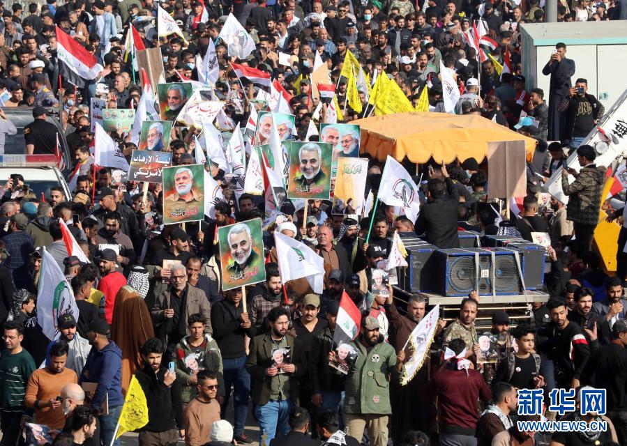 1月3日,在伊拉克巴格达,人们手举苏莱曼尼和穆汉迪斯形象的海报和伊拉克国旗参加苏莱曼尼和穆汉迪斯遇袭身亡一周年悼念活动。