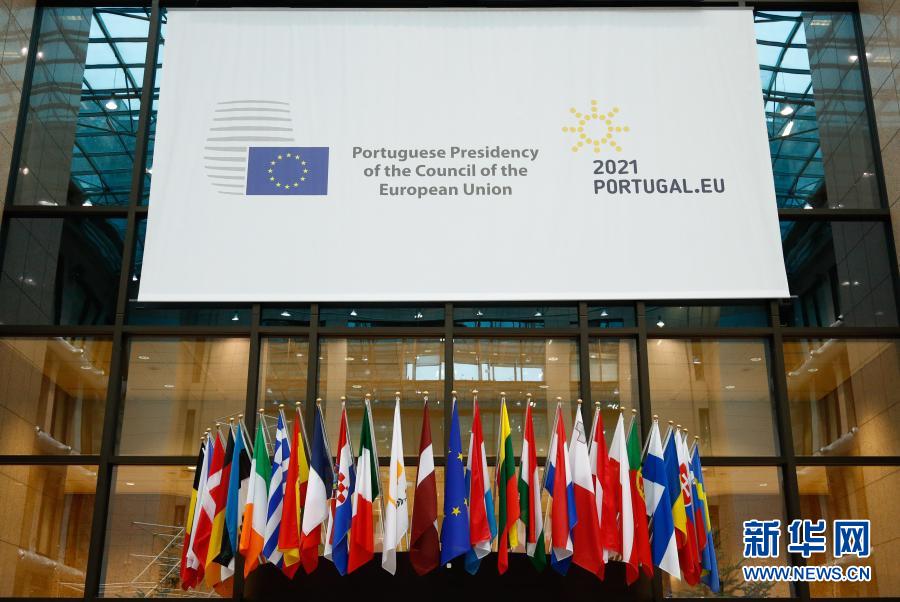 这是1月5日在比利时布鲁塞尔拍摄的欧盟理事会总部大厦内葡萄牙担任欧盟轮值主席国标志。