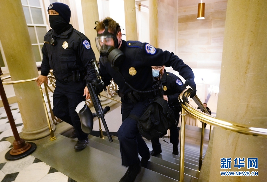 这是1月6日在美国华盛顿拍摄的国会警察紧急应对闯入国会的抗议者的资料照片。新华社发(Pool图片,凯文·迪奇摄)