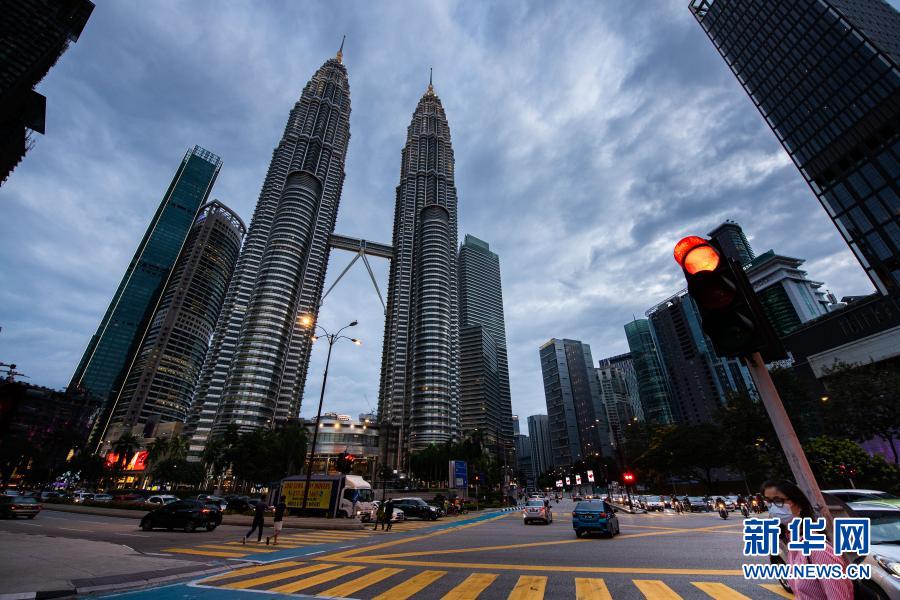 1月12日,在马来西亚吉隆坡的马来西亚国家石油公司双塔前,一名女子戴着口罩等待红绿灯。