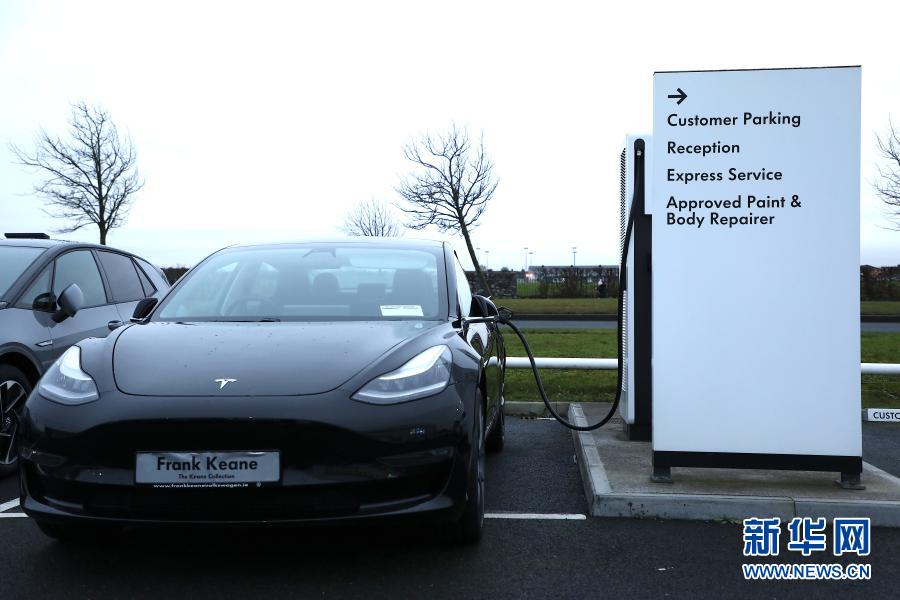 1月12日,在爱尔兰首都都柏林,一辆电动车在充电桩旁充电。