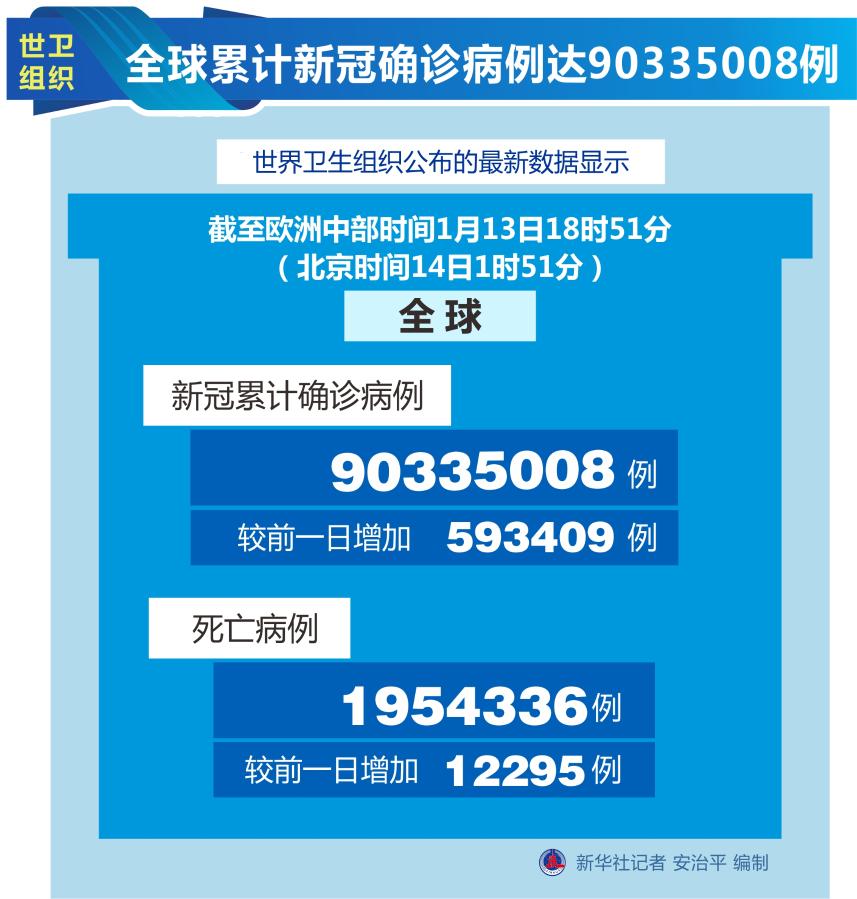 新华社日内瓦1月13日电(记者刘曲)世界卫生组织13日公布的最新数据显示,全球累计新冠确诊病例达90335008例。