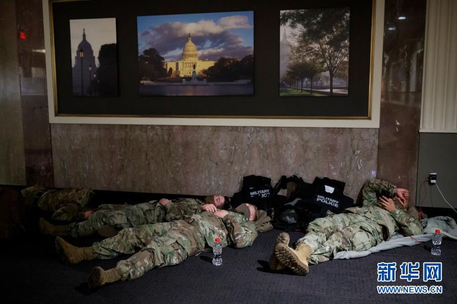 1月14日,美国国民警卫队士兵在位于首都华盛顿特区的国会建筑内休整。