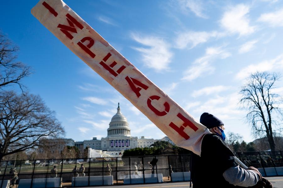 1月13日,在美国首都华盛顿,一名手持“弹劾”标语的男子从国会大厦前走过。新华社记者刘杰摄