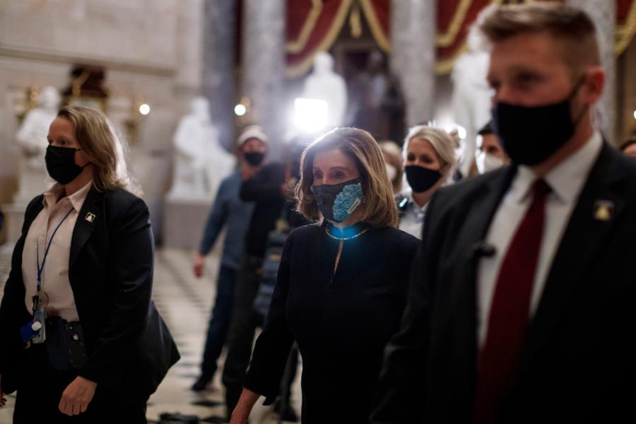 1月13日,在美国首都华盛顿,国会众议院议长佩洛西(前右二)走在国会大厦内。新华社发(沈霆摄)