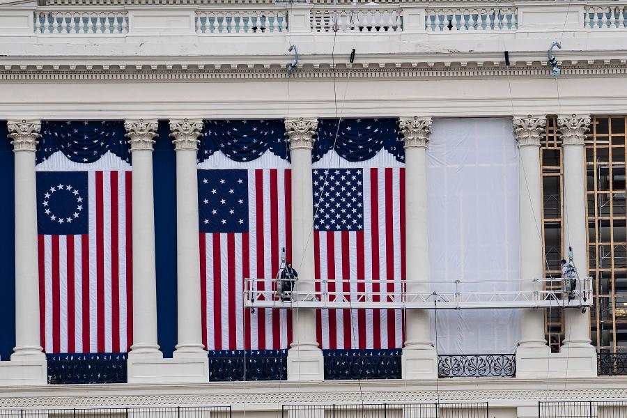 1月11日,在美国首都华盛顿,工作人员在国会大厦外悬挂旗帜,为下届总统的就职典礼做准备。新华社记者刘杰摄