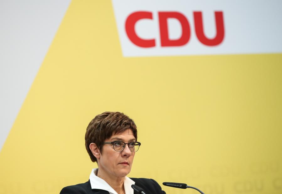 2020年2月24日,在德国首都柏林的德国基督教民主联盟(基民盟)总部,安妮格雷特·克兰普-卡伦鲍尔出席新闻发布会。新华社记者 单宇琦 摄