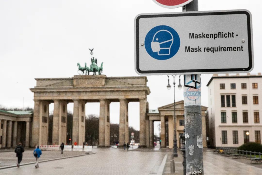 这是1月6日拍摄的德国柏林勃兰登堡门前的“要求佩戴口罩”标识。新华社/欧新