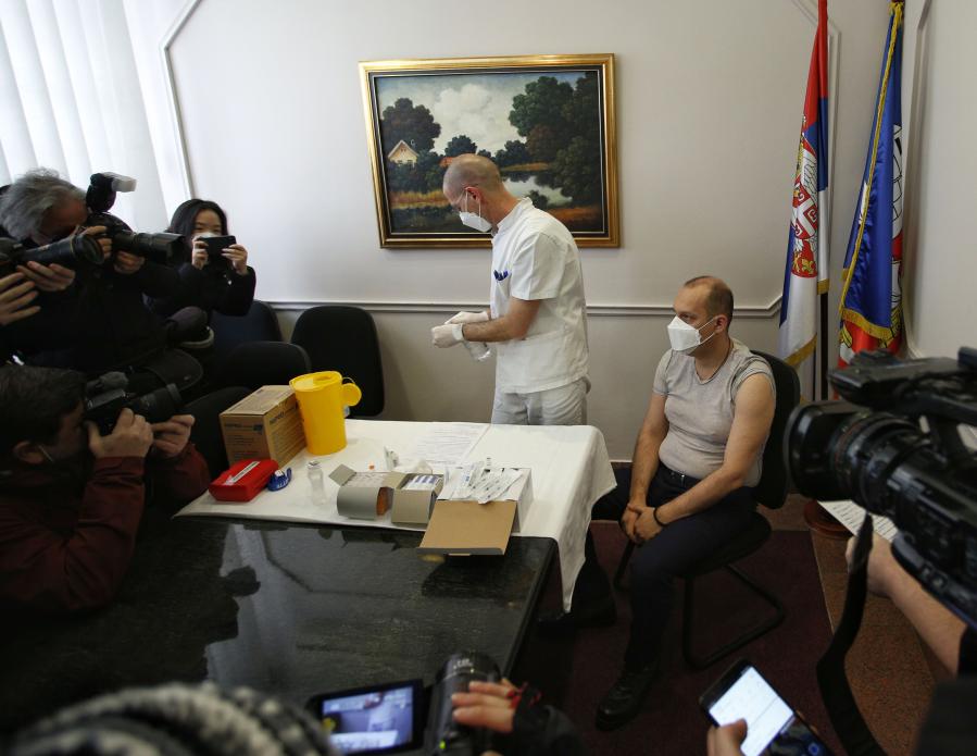 1月19日,塞尔维亚卫生部长隆查尔(右一)在塞尔维亚首都贝尔格莱德准备接种中国新冠疫苗。新华社发(塞尔维亚通讯社供图)