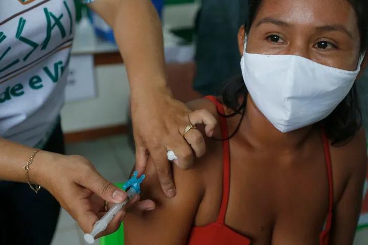 1月19日,在巴西亚马孙州塔巴廷加市,医护人员为一名原住民接种中国新冠疫苗。新华社发(卢西奥·塔沃拉摄)