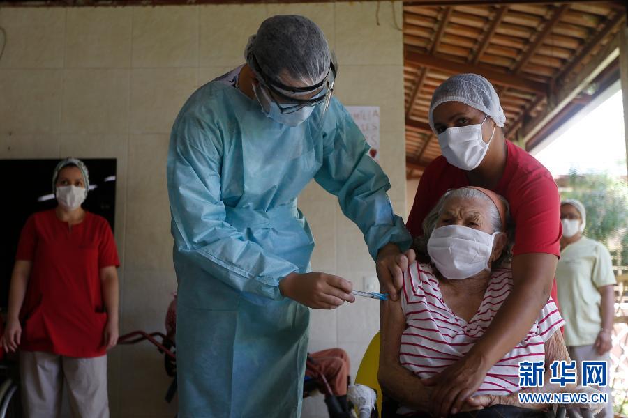 1月22日,在巴西首都巴西利亚的一家福利院,医护人员为老人接种新冠疫苗。新华社发(卢西奥·塔沃拉摄)