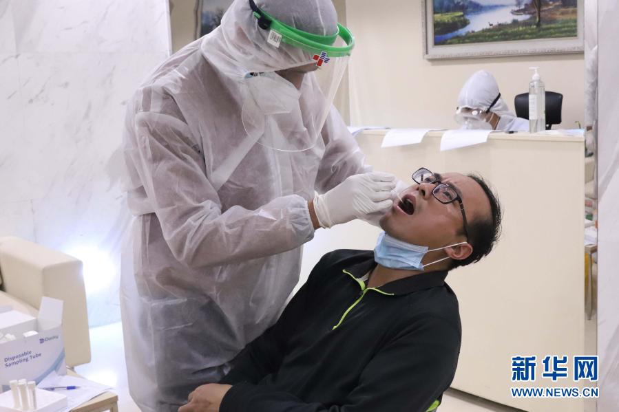 1月23日,在巴基斯坦萨希瓦尔燃煤电站,医务人员为入场人员进行新冠病毒检测取样。