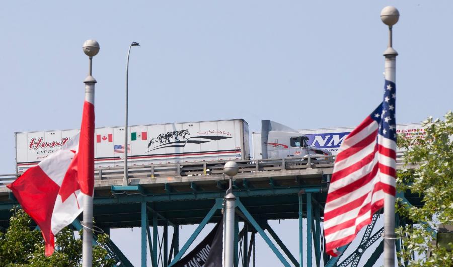 2017年8月16日,在加拿大安大略省温莎市,一辆印有墨西哥、加拿大与美国国旗的长途货车(左)通过大使桥开往美国。(新华社发,邹峥摄)