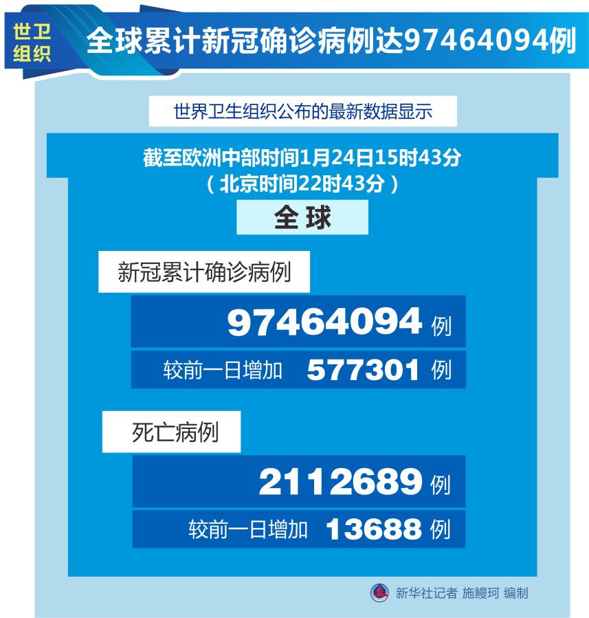 新华社日内瓦1月24日电(记者刘曲)世界卫生组织24日公布的最新数据显示,全球累计新冠确诊病例达97464094例。