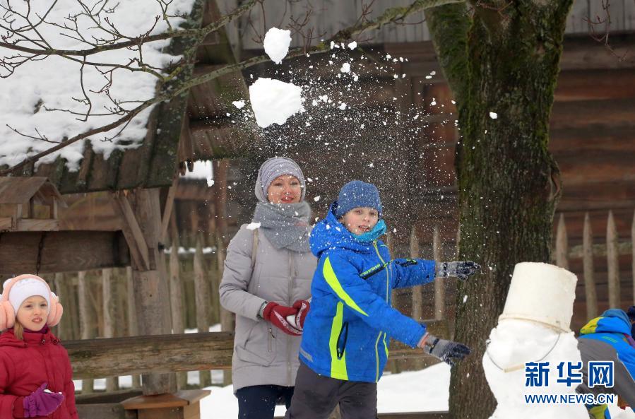 1月24日,孩子们在白俄罗斯首都明斯克郊区的民族建筑博物馆内打雪仗。新华社发(任科夫摄)