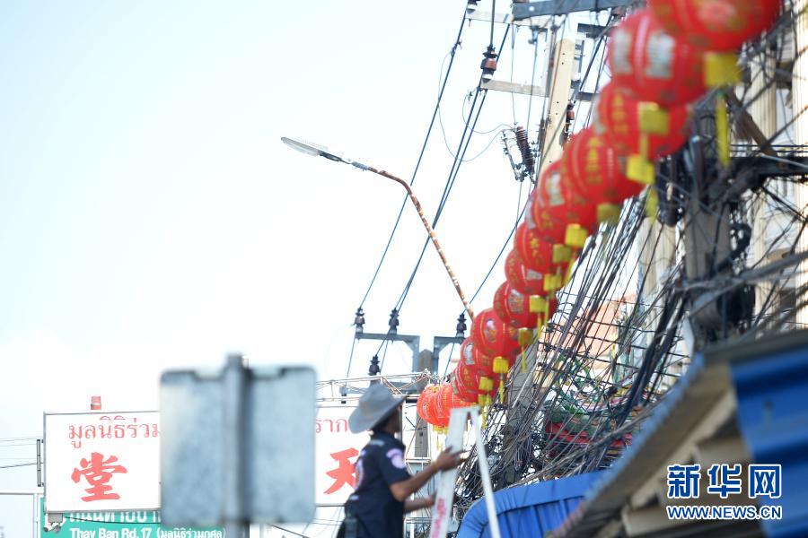 1月25日,工作人员在泰国曼谷一处街道旁悬挂红灯笼,迎接即将到来的中国春节。新华社发(拉亨摄)