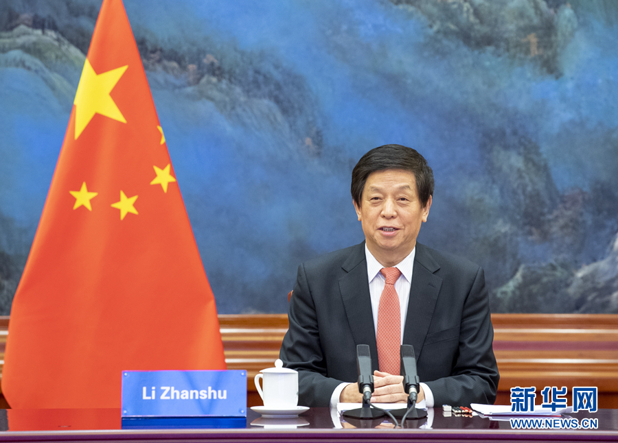 1月25日,全国人大常委会委员长栗战书在北京人民大会堂以视频方式同伊朗议长卡利巴夫举行会谈。新华社记者 高洁 摄