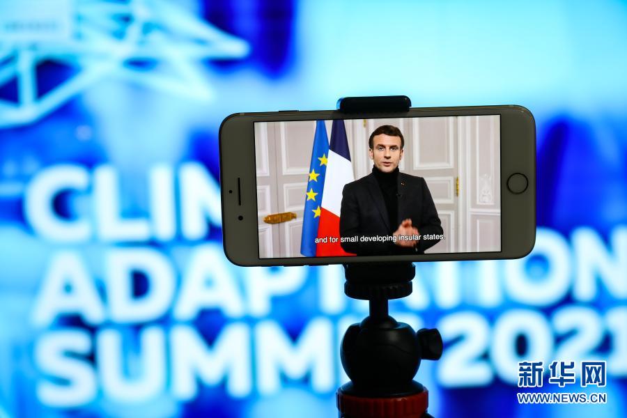 这是1月25日在比利时布鲁塞尔拍摄的法国总统马克龙在首届气候适应峰会上发表视频讲话的屏幕画面。
