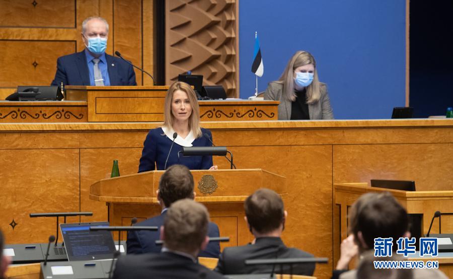 1月25日,在爱沙尼亚首都塔林,爱沙尼亚改革党主席卡娅·卡拉斯(中)在议会公布施政纲领。爱沙尼亚议会25日晚投票确认改革党主席卡娅·卡拉斯出任新总理,并授权其组阁。新华社发(爱沙尼亚议会供图)