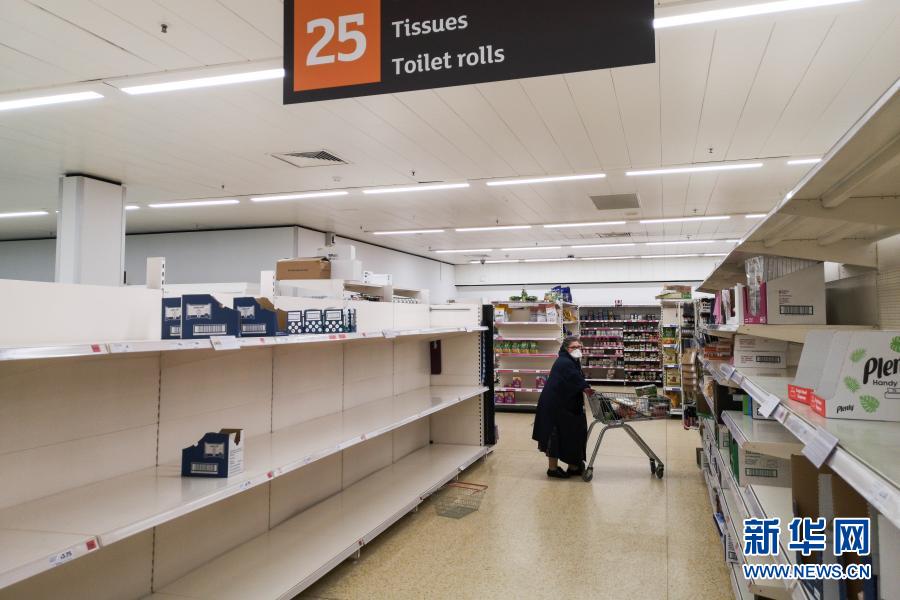 2020年3月20日,在英国伦敦的一家超市,一名女士从空荡的货架旁走过。新华社发(乔·纽曼摄)
